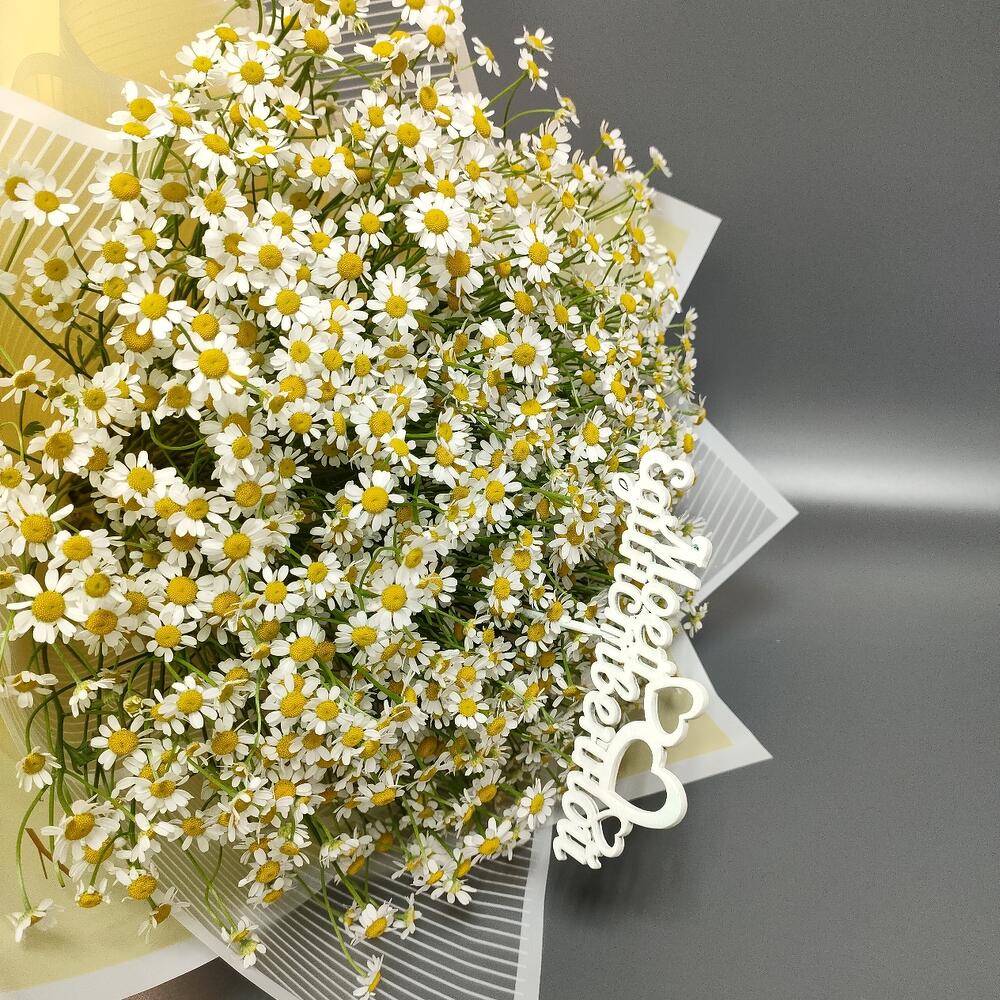 Матрикария – 21 шт.Пленка матовая – 1 шт.Лента атласная – 1 шт.Топпер – 1 шт.