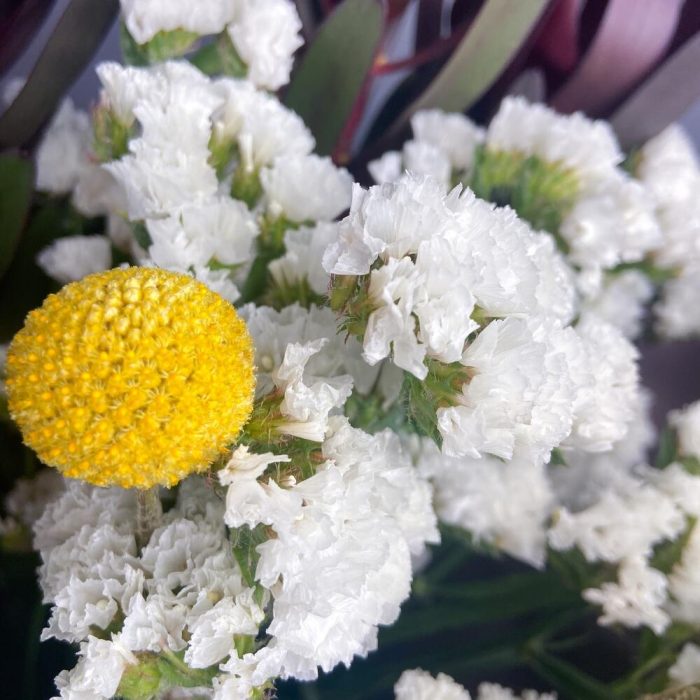 Упаковка – 1 шт.Статица белая – 3 шт.Краспедия желтая – 3 шт.Сафари бордовая – 3 шт.