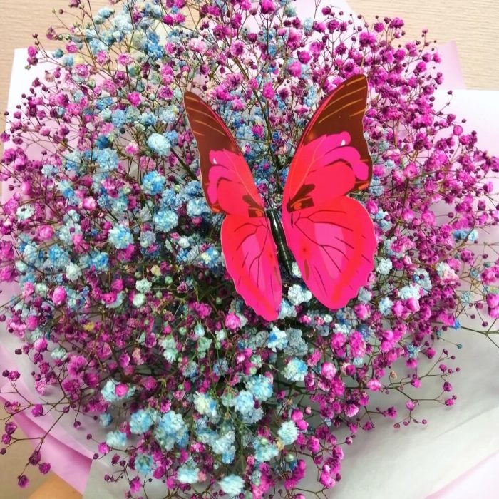 гипсофила радужная – 5 шт.Бабочка декоративная – 1 шт.Упаковка дизайнерская – 1 шт.Лента – 1 шт.