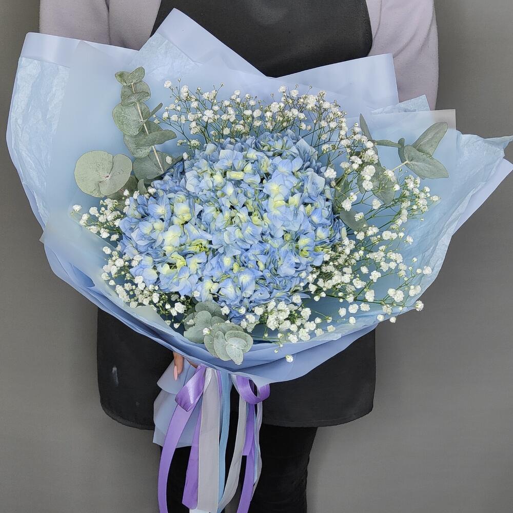 Гипсофила – 1 шт.Гортензия – 1 шт.Эвкалипт – 2 шт.Лента атласная – 1 шт.Тишью – 2 шт.Упаковка дизайнерская – 2 шт.