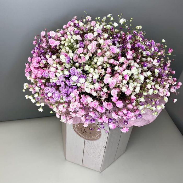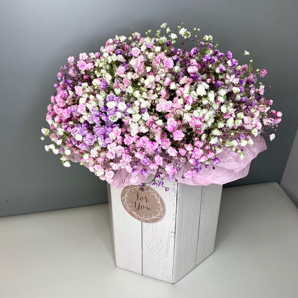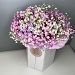 “Сиреневый туман” – композиция из гипсофилы в шляпной коробке