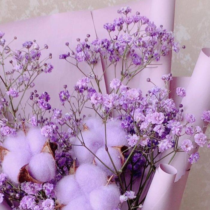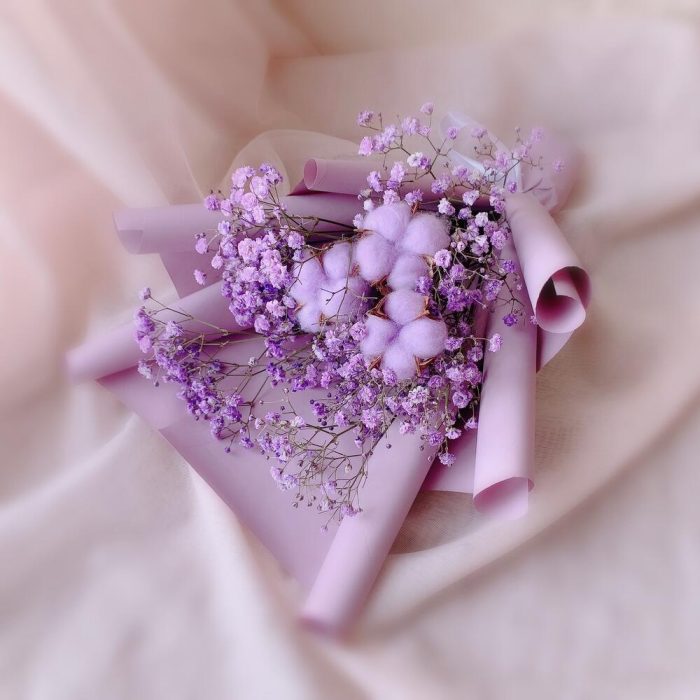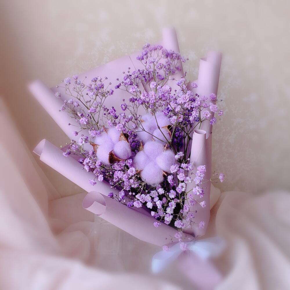 Хлопок – 3 шт.Лента атласная – 1 шт.Гипсофила фиолетовая – 1 шт.Дизайнерская упаковка – 1 шт.