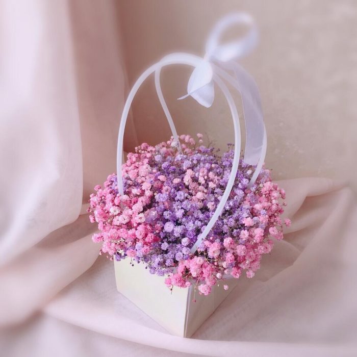Сумочка – 1 шт.Флористическая губка – 1 шт.Инструкция по уходу – 1 шт.гипсофила радужная – 3 шт.
