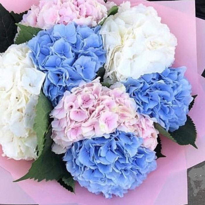 ассорти гортензий – 7 шт.Упаковка дизайнерская – 1 шт.Лента атласная – 2 шт.хорошее настроение – 100 шт.Открытка – 1 шт.инструкция по уходу за цветами – 1 шт.коробка переноска – 1 шт.Кризал – 1 шт.