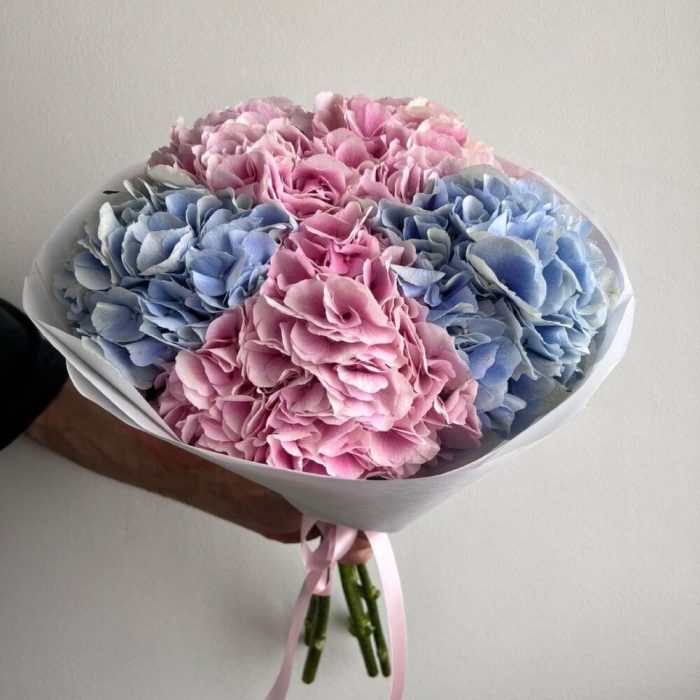 Гортензия розовая – 3 шт.Гортензия голубая – 2 шт.Упаковка дизайнерская – 1 шт.Лента атласная – 2 шт.Открыточка с вашими пожеланиями – 1 шт.хорошее настроение – 100 шт.инструкция по уходу за цветами – 1 шт.коробка переноска – 1 шт.Кризал – 1 шт.