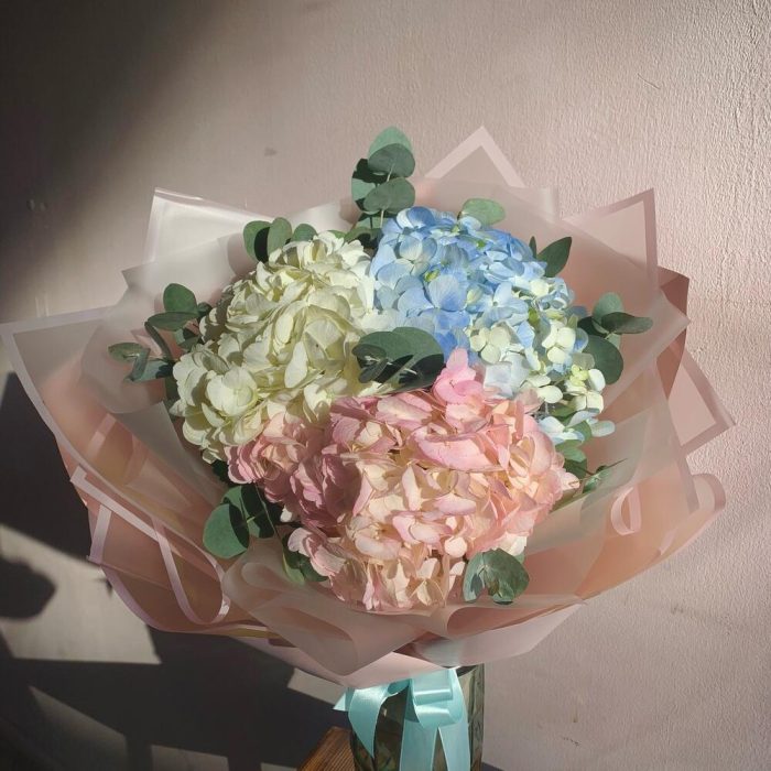 Гортензия – 3 шт.Эвкалипт – 5 шт.Лента атласная – 1 шт.Упаковка дизайнерская – 2 шт.