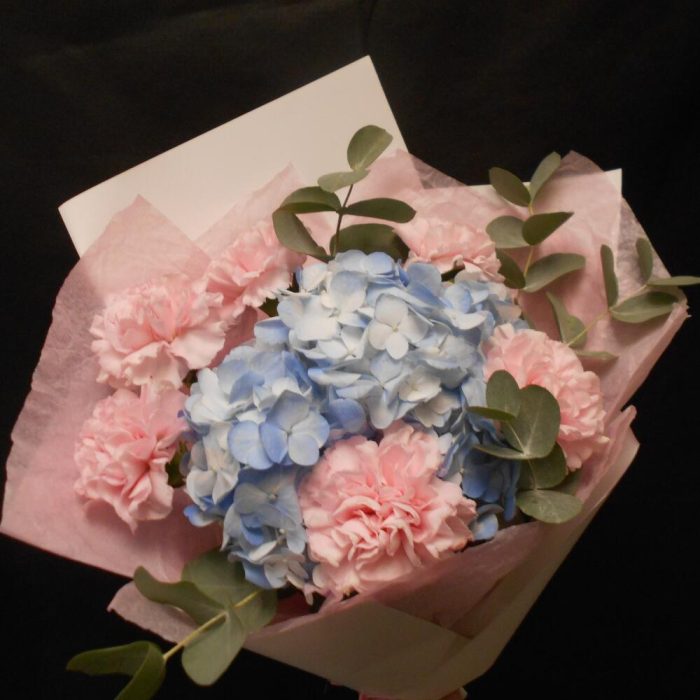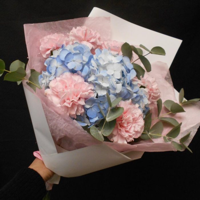 Лента атласная – 3 шт.Гортензия голубая – 1 шт.бумага тишью розовая – 3 шт.пленка матовая белая – 4 шт.гвоздики одноголовые розовые – 6 шт.ветви эвкалипта сухоцвет – 5 шт.