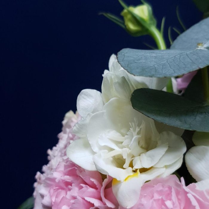 Альстромерия – 2 шт.Лизиантус – 3 шт.Диантус – 3 шт.Диантус кустовой – 2 шт.сочная зелень – 5 шт.Брендированная коробка – 1 шт.Роза кустовая – 1 шт.
