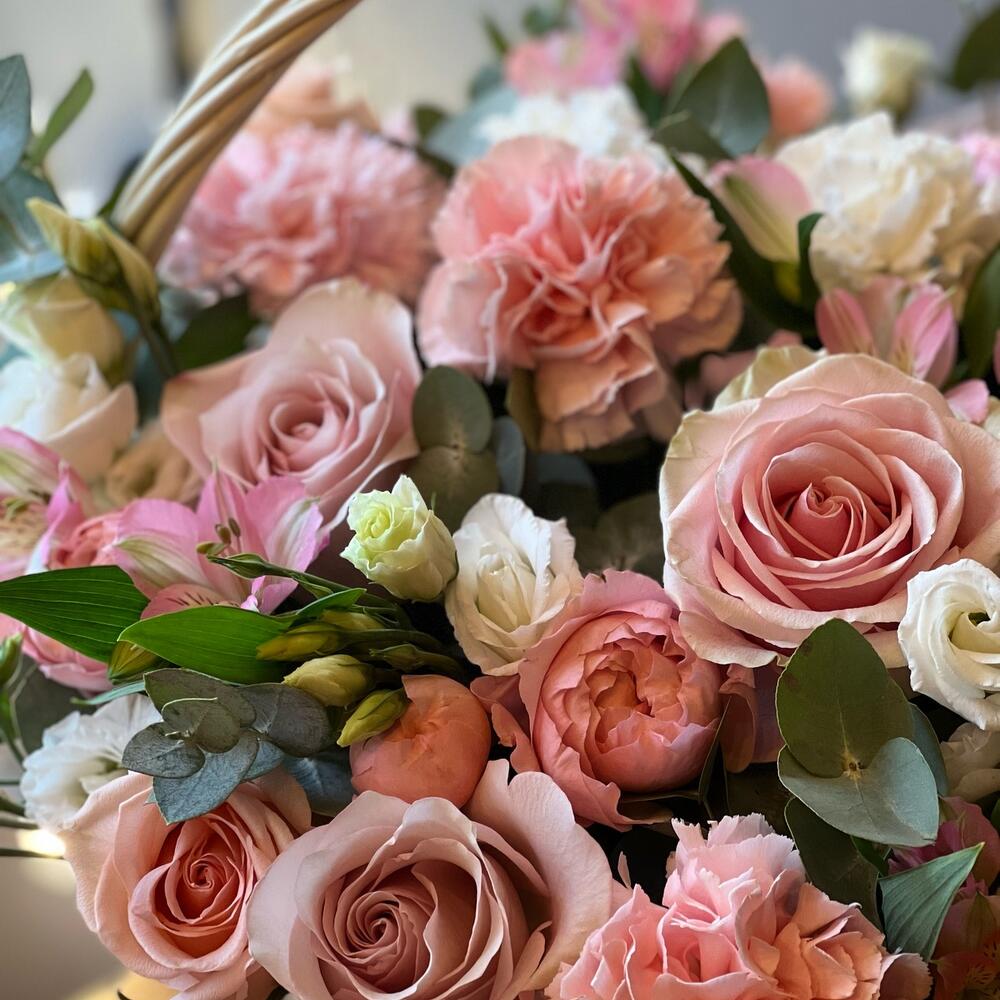 Эвкалипт – 11 шт.Роза Эквадор – 11 шт.Эустома – 7 шт.Диантус – 9 шт.Корзина плетеная – 1 шт.Альстромерия Микс Европа – 7 шт.Оазис флористический – 2 шт.пленка транспортировочная – 1 шт.работа флориста – 1 шт.