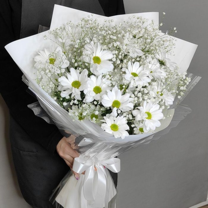 Букет из белоснежных ромашек и воздушной гипсофилы “Ромашки в снегу”