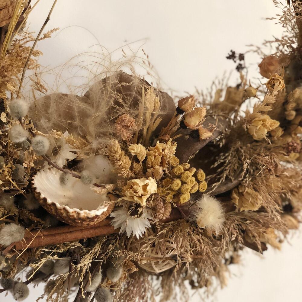 букет из сухоцветов микс – 10 шт.Основа для венка – 1 шт.верба пучок – 3 шт.ракушки декор – 1 шт.Шар ротанг – 1 шт.Палочки корицы – 5 шт.гелихризум (сухоцвет) – 5 шт.