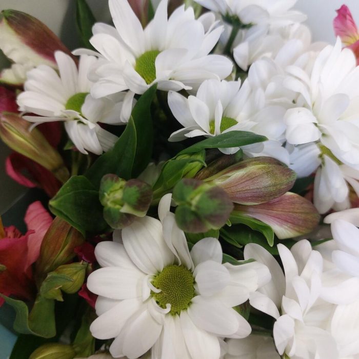 Хризантема кустовая – 4 шт.Альстромерия – 5 шт.Упаковка дизайнерская – 3 шт.Лента атласная – 2 шт.