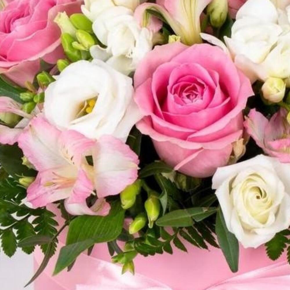 Коробка шляпная – 1 шт.Оазис флористический – 1 шт.зелень декоративная – 5 шт.Эустома – 2 шт.Альстромерия – 4 шт.Роза – 7 шт.Лента атласная – 1 шт.