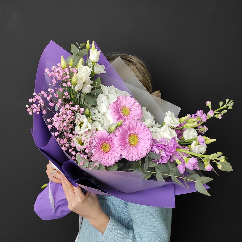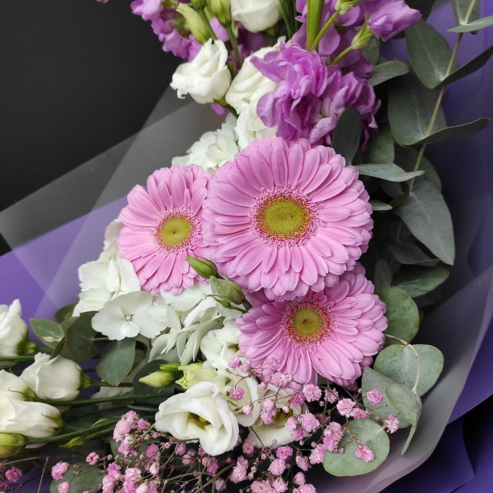 Гербера – 3 шт.Маттиола – 2 шт.Гортензия – 1 шт.Гипсофила – 1 шт.Эустома – 2 шт.Эвкалипт – 3 шт.Пленка матовая – 3 шт.