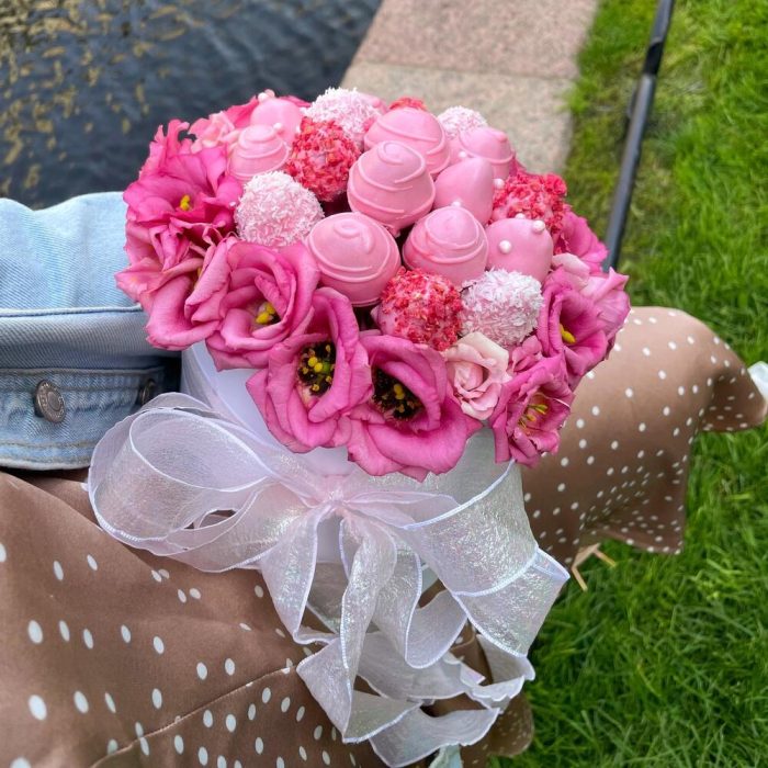 В состав набора входит:— 300 грамм свежей клубники в бельгийском шоколаде Callebaut, шоколад: розовый, белыйдекор: кокосовая стружка, жемчужные сахарные шарики, сублимированная малина.— Эустома розовая ( оттенок цветка может отличаться , в зависимости от поставки)Примечание:— Композиции составляются из клубники по весу, а не по количеству, так как ягода может быть разного сорта, количество ягод может отличаться.— Бокс бережно упакован в прозрачную пленку для защиты от внешних факторов.— Натуральный продукт. Срок годности клубники в шоколаде до 24 часов. Храните ягоду в холодильнике при температуре +4..+8 градусов.