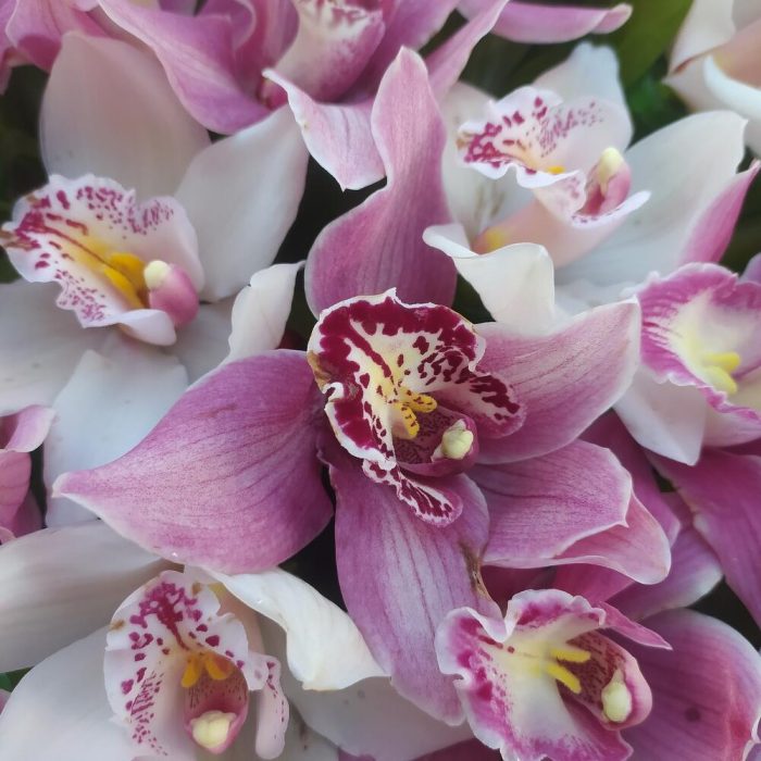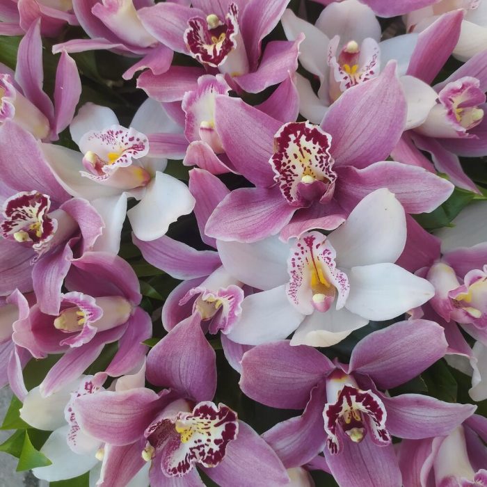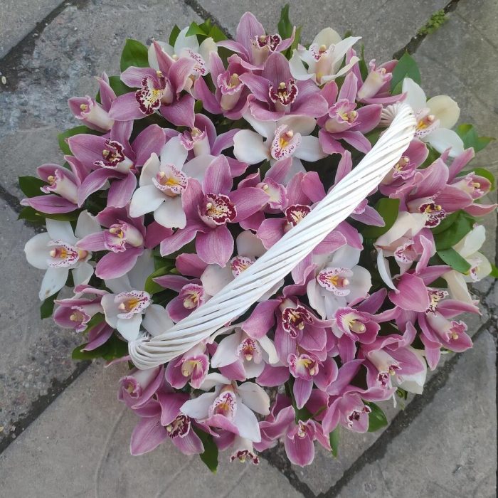 Орхидея Цимбидиум ветка – 3 шт.Корзина плетеная – 1 шт.зелень декоративная – 10 шт.Оазис флористический – 2 шт.