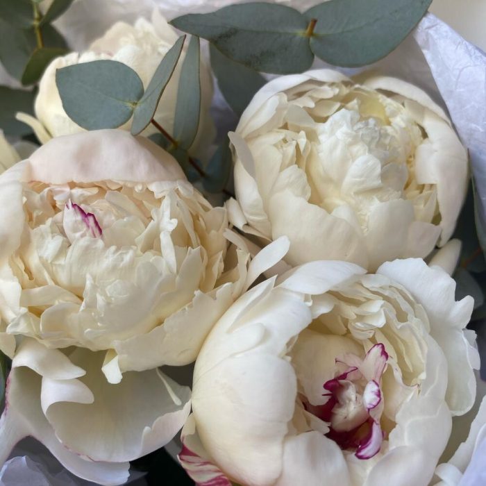 Эвкалипт – 5 шт.Лента атласная – 1 шт.Пион белый – 5 шт.Тишью белое – 1 шт.Пленка дизайнерская – 1 шт.