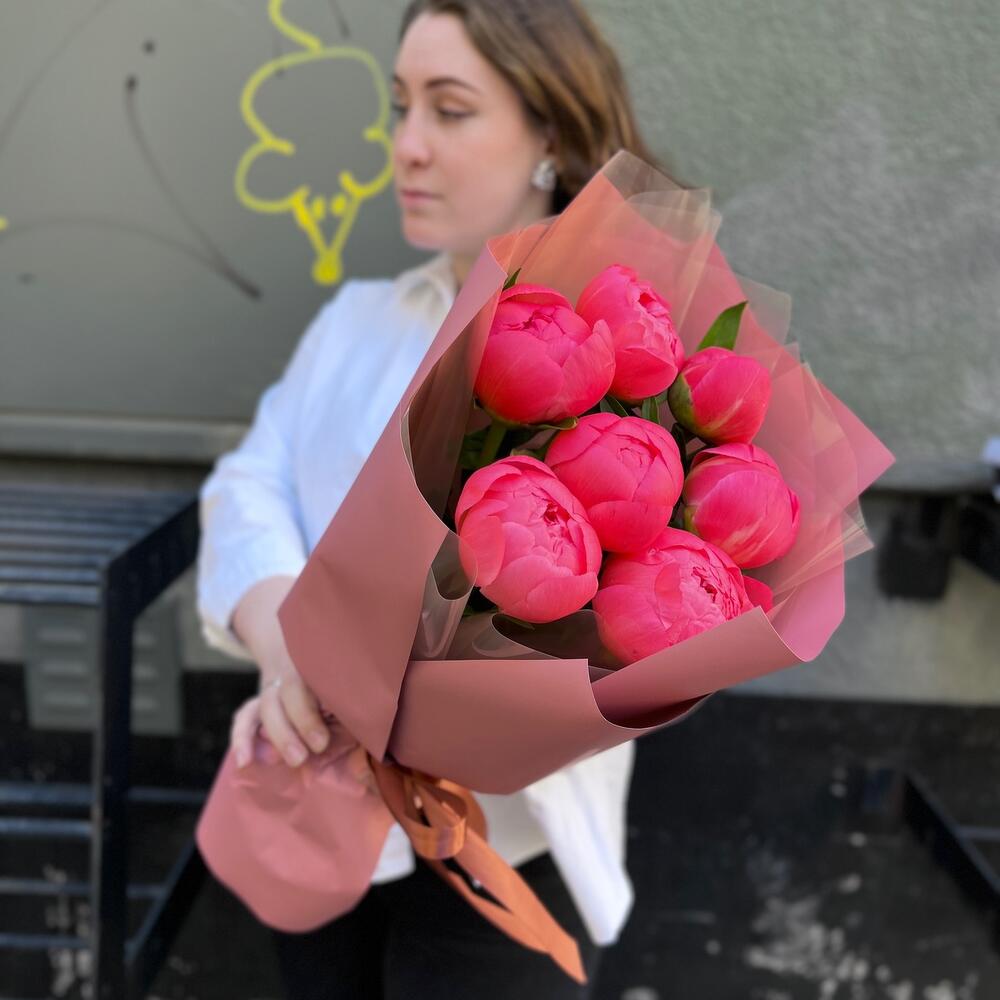 Лента атласная – 2 шт.Пленка матовая – 7 шт.Пион коралл шарм – 7 шт.