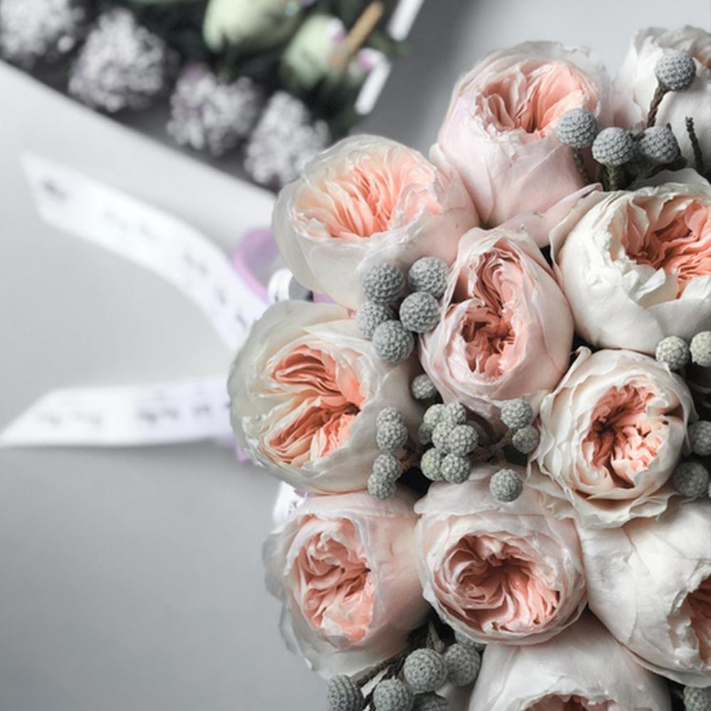 Роза пионовидная – 19 шт.Бруния – 10 шт.Лента – 2 шт.Коробка – 1 шт.