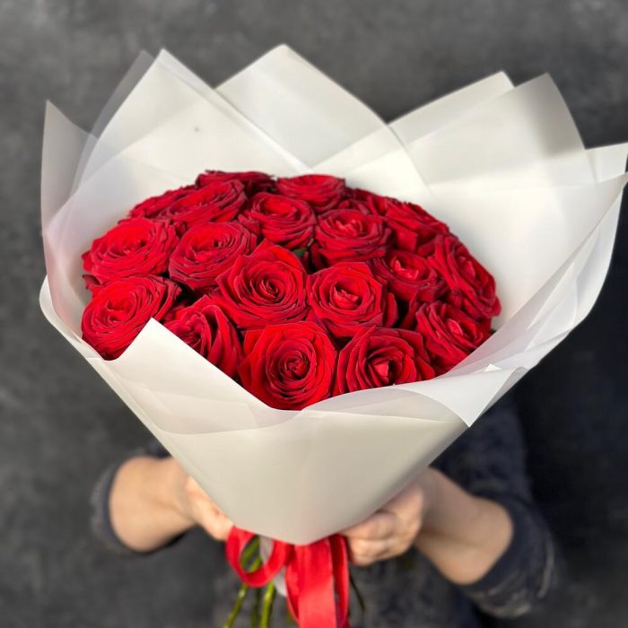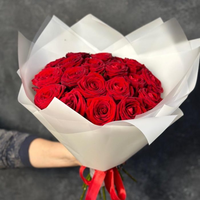 Лента атласная – 1 шт.Стильная упаковка – 1 шт.утеплитель букета – 1 шт.роза ред наймоми – 19 шт.