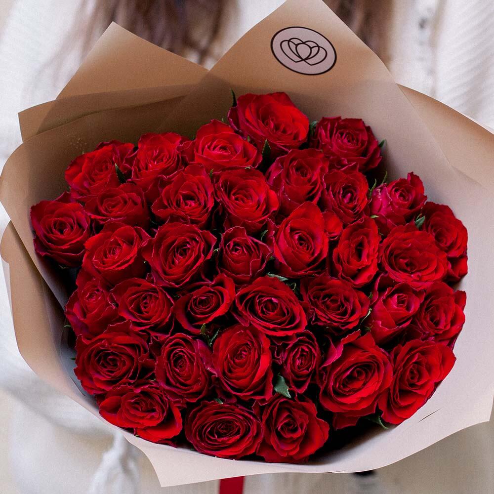 Букет из 35 красных роз (Кения) 40 см в кремовой пленке