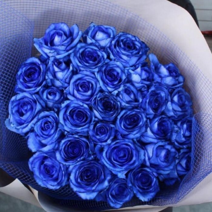 Роза синяя – 35 шт.Упаковка дизайнерская – 2 шт.Лента атласная – 2 шт.Открыточка с вашими пожеланиями – 1 шт.хорошее настроение – 100 шт.инструкция по уходу за цветами – 1 шт.коробка переноска – 1 шт.Кризал – 1 шт.