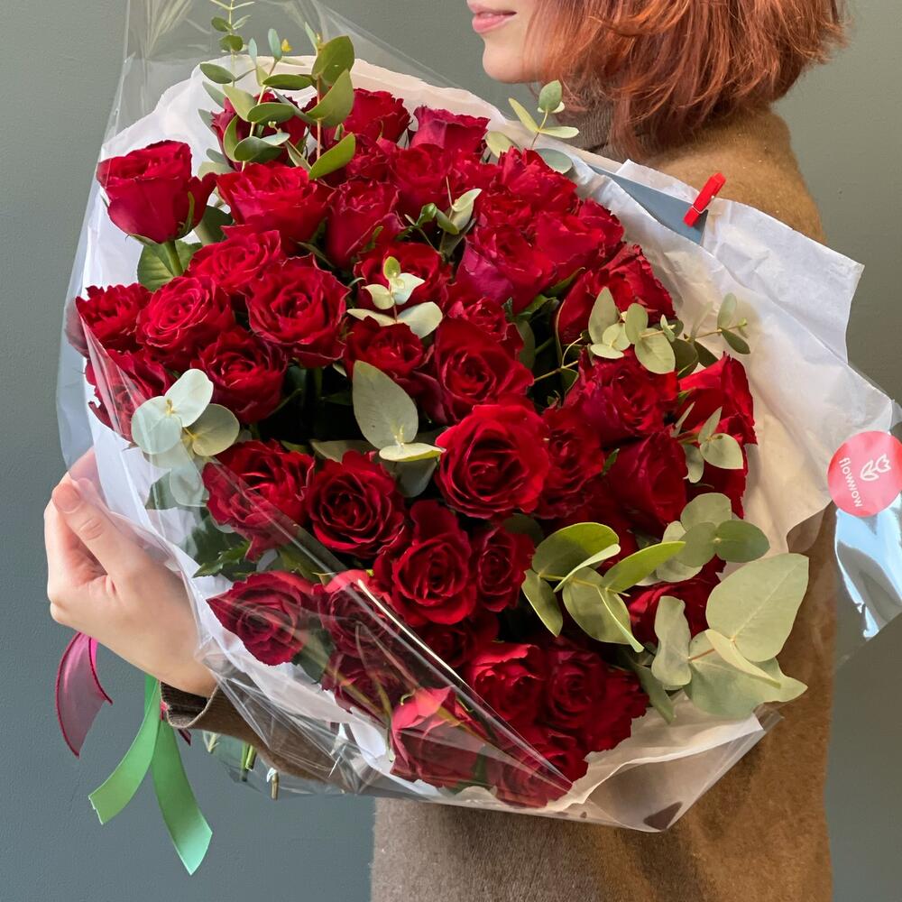 Эвкалипт – 3 шт.Роза – 51 шт.Упаковка дизайнерская – 1 шт.