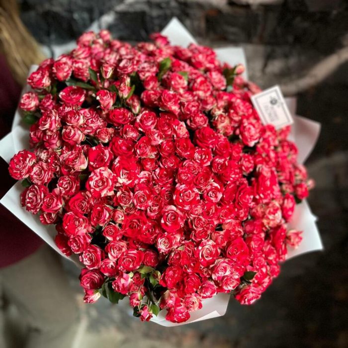 Букет из 59 кустовых роз в стильной упаковке “Пламенное приветствие”