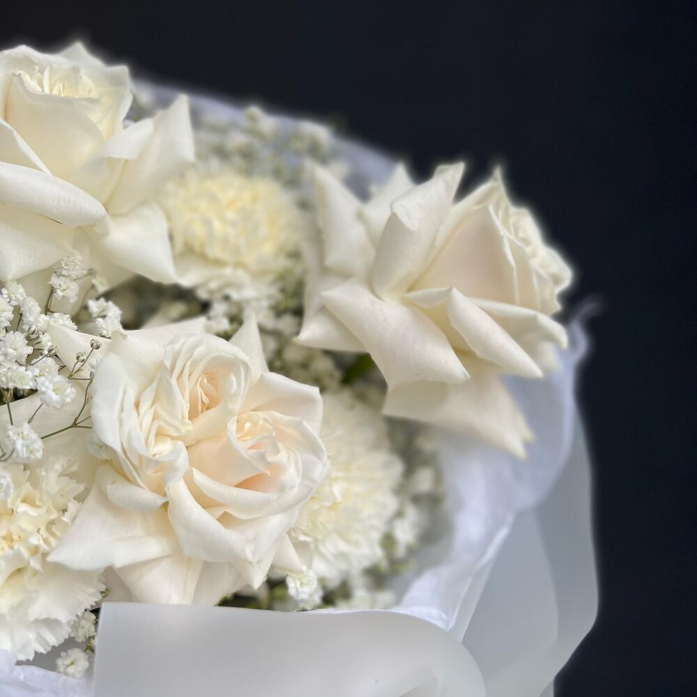 Букет из белой розы диантусов и Гипсофилы