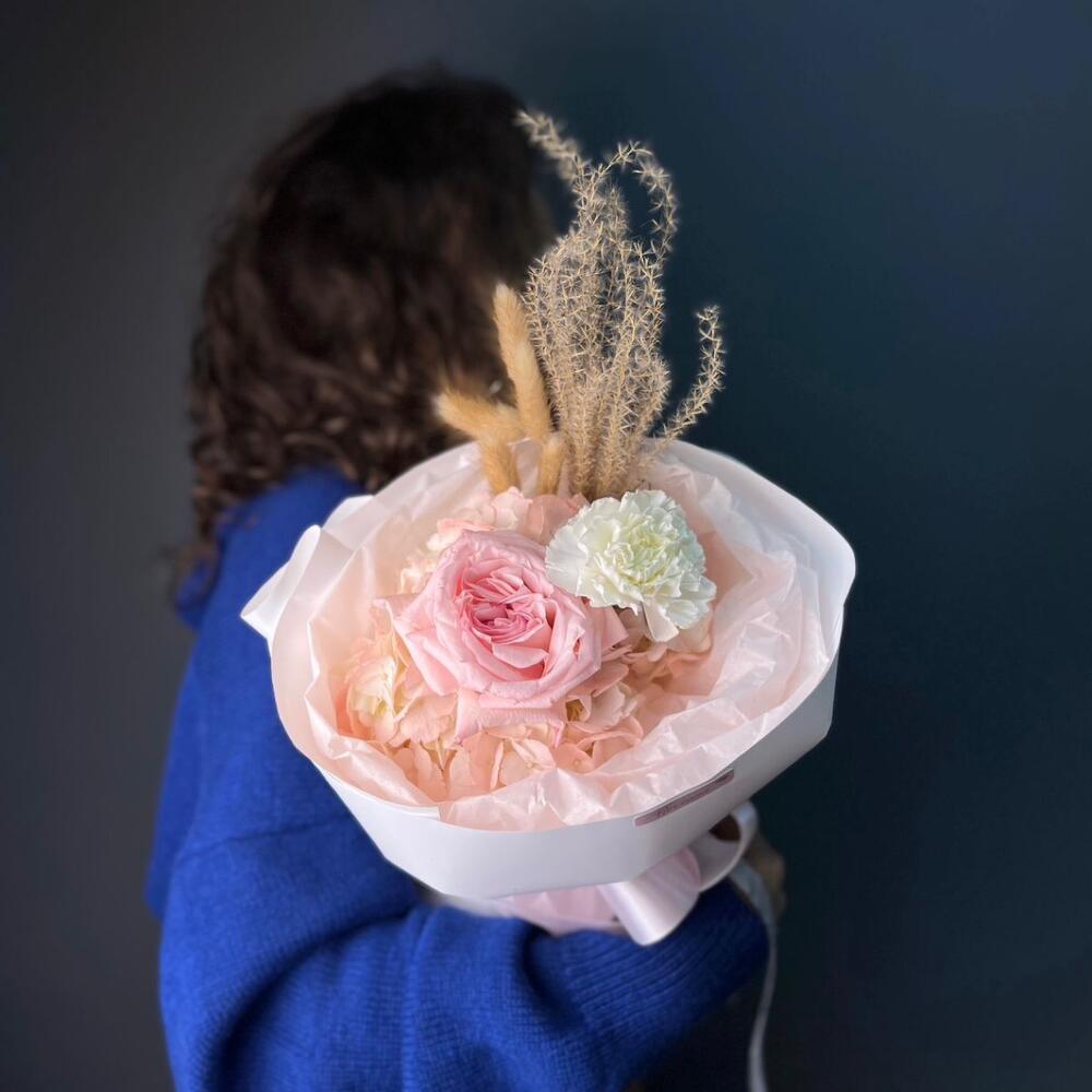Гортензия – 1 шт.Гвоздика – 1 шт.Сухоцветы – 6 шт.Упаковка дизайнерская – 2 шт.роза кендилайт – 1 шт.