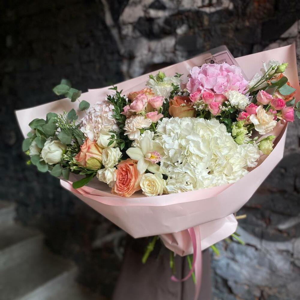 Букет из гортензий, пионов и пионовидных роз «Струны души»
