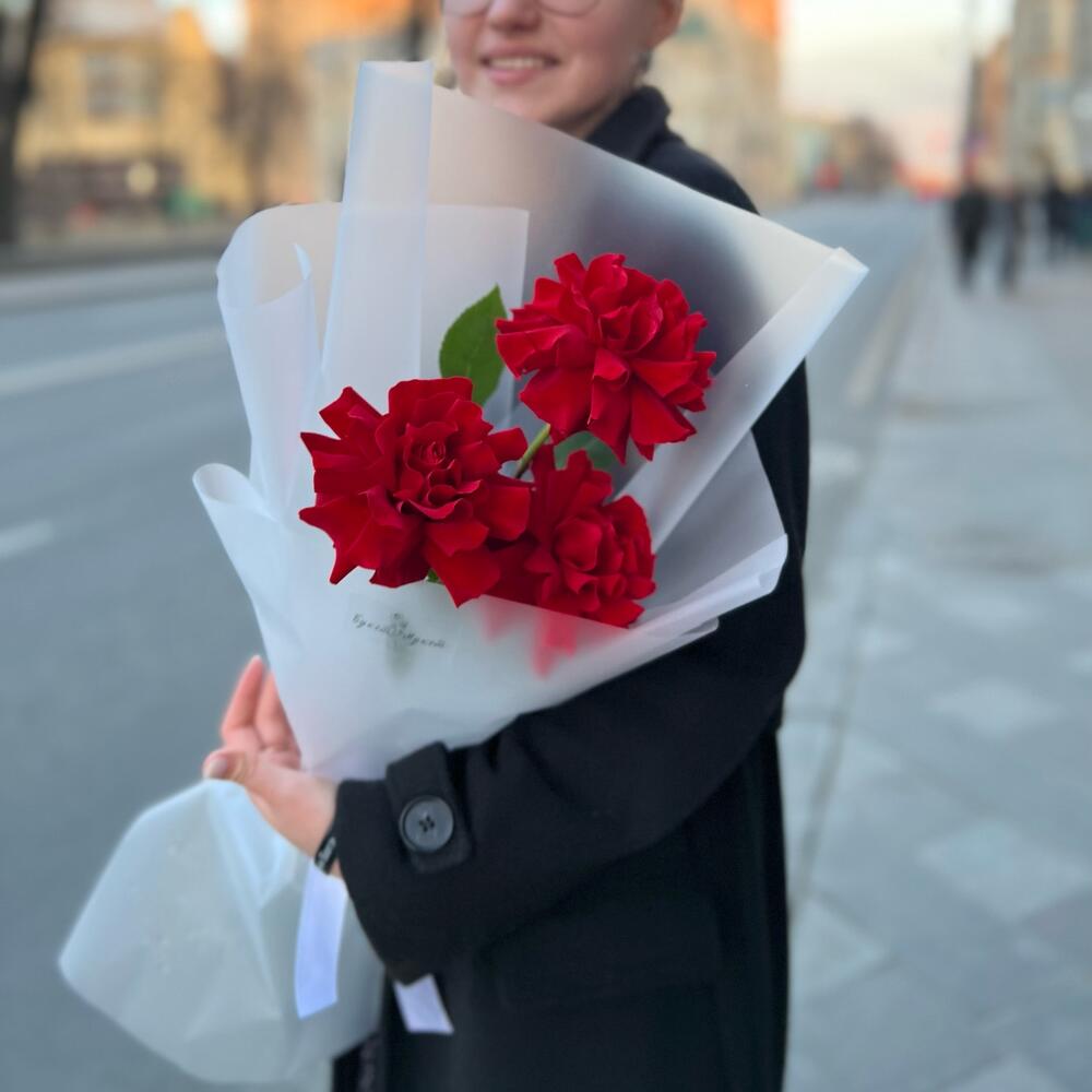 Роза красная – 3 шт.Лента атласная – 1 шт.Пленка матовая – 2 шт.