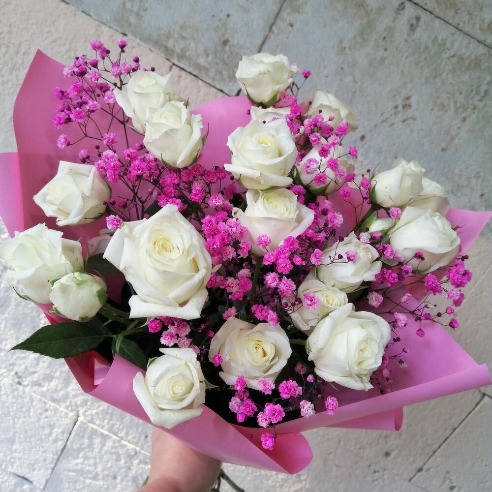 Букет из кустовой розы с гипсофилой