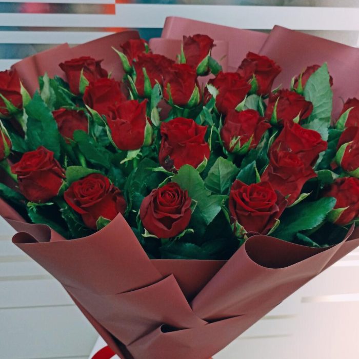 Лента атласная – 2 шт.Упаковка дизайнерская – 4 шт.роза красная россия 70 см – 27 шт.