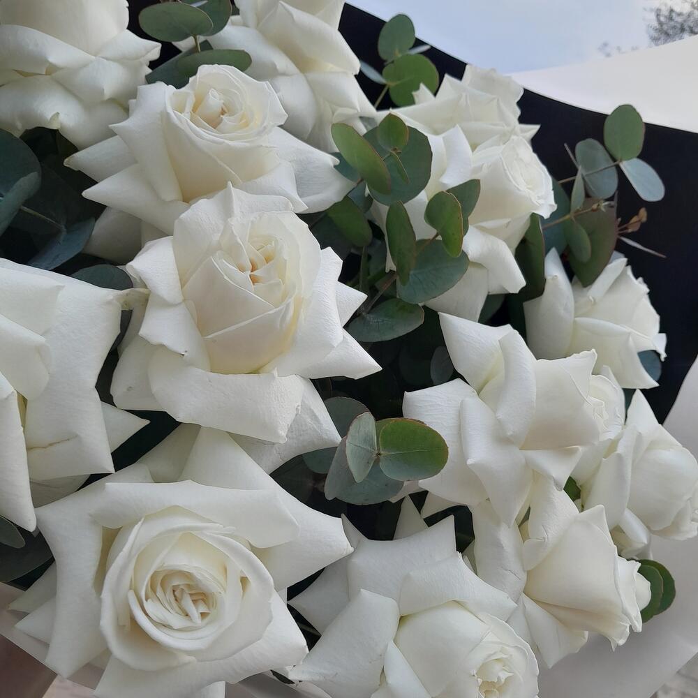 Букет молочных французских роз с пряным эвкалиптом