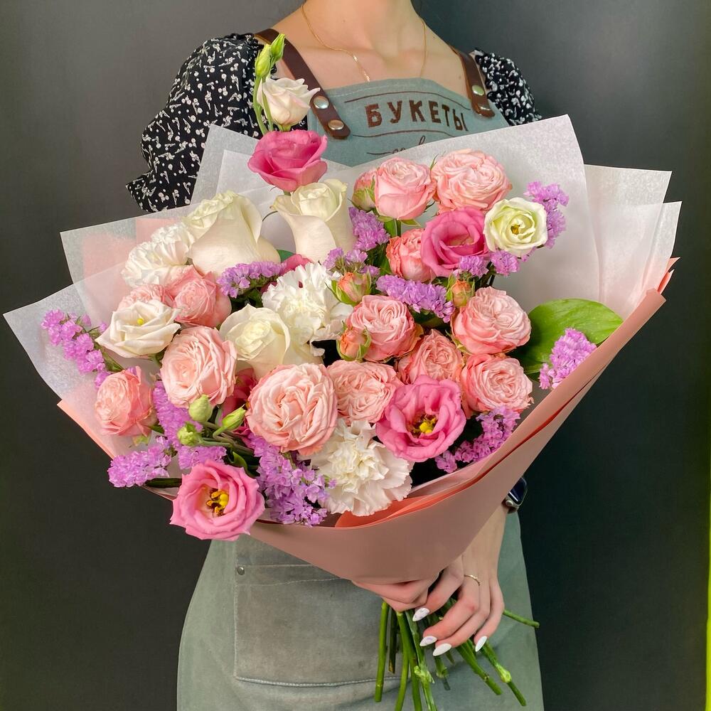 Роза Эквадор белая – 3 шт.Роза кустовая пионовидная – 3 шт.Диантус – 4 шт.эустома пинк – 3 шт.статица розовая кустовая – 3 шт.зелень декоративная – 5 шт.Упаковка дизайнерская – 2 шт.