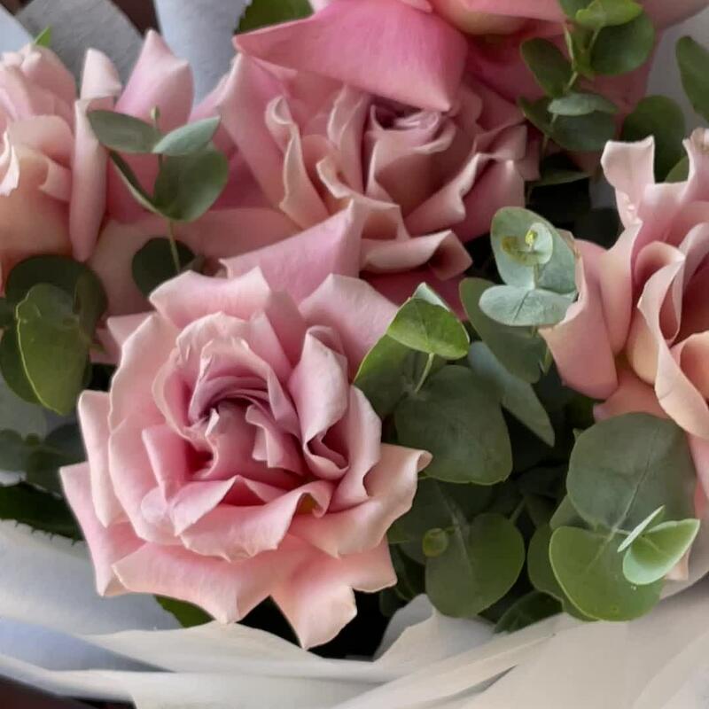 Лента – 2 шт.Эвкалипт – 2 шт.Роза одноголовая – 5 шт.Упаковка дизайнерская – 2 шт.