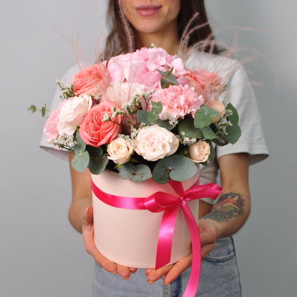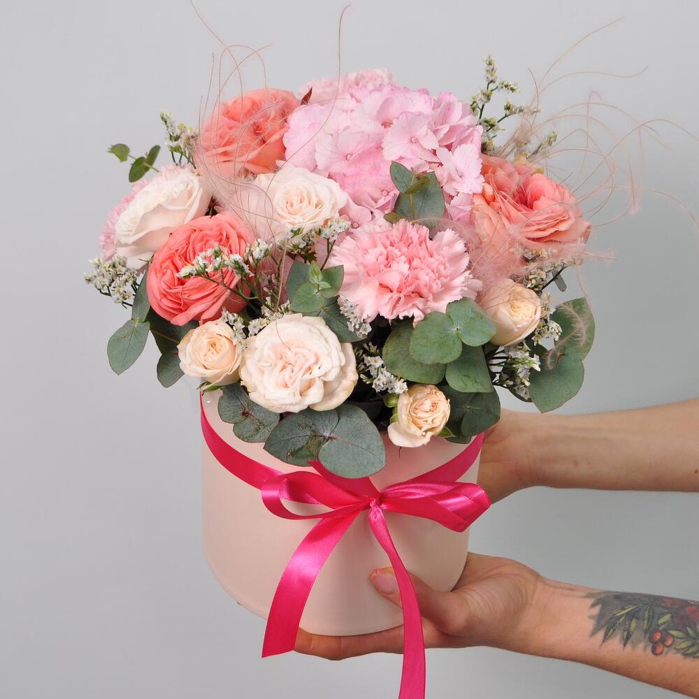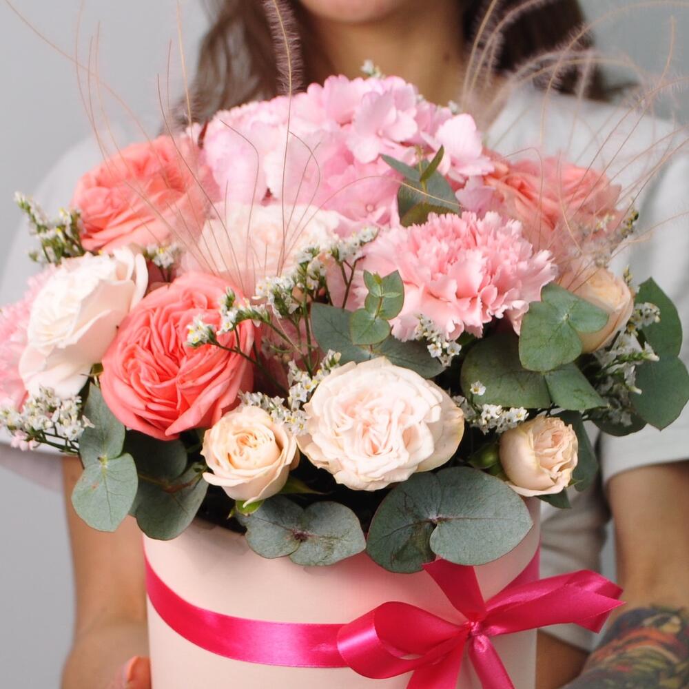 Гортензия и пионовидные розы в коробке «Милашка»