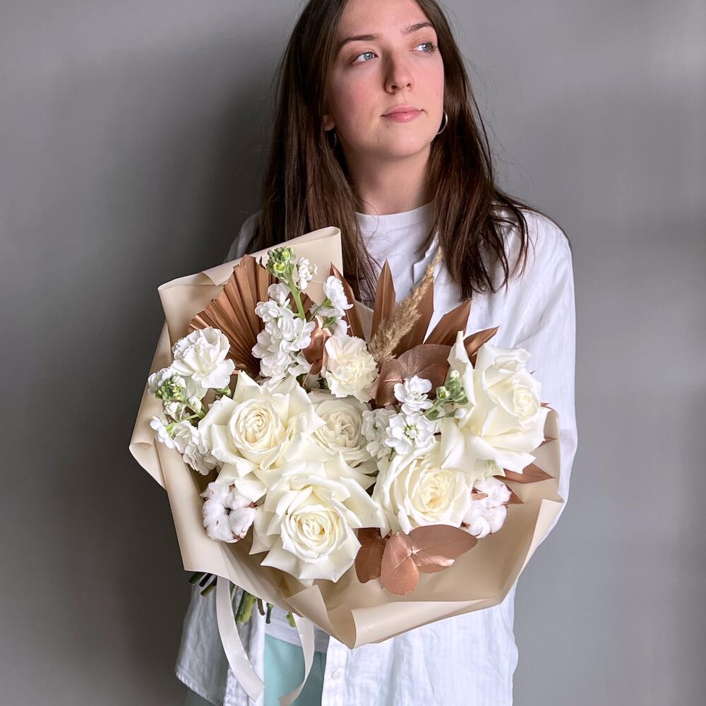Лента – 1 шт.Маттиола – 3 шт.Гвоздика – 2 шт.Эвкалипт крашеный – 3 шт.Хлопок натуральный – 2 шт.Дизайнерская упаковка – 1 шт.сухоцвет пушистый – 2 шт.фисташка крашеная – 1 шт.пальма пика крашеная – 1 шт.пальма веерная крашеная – 1 шт.роза playa blanca премиум – 5 шт.