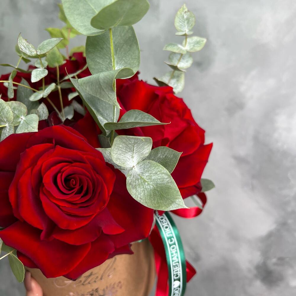 Эвкалипт – 3 шт.Роза Эквадор – 5 шт.Лента атласная – 2 шт.Коробка шляпная – 1 шт.Оазис флористический – 1 шт.