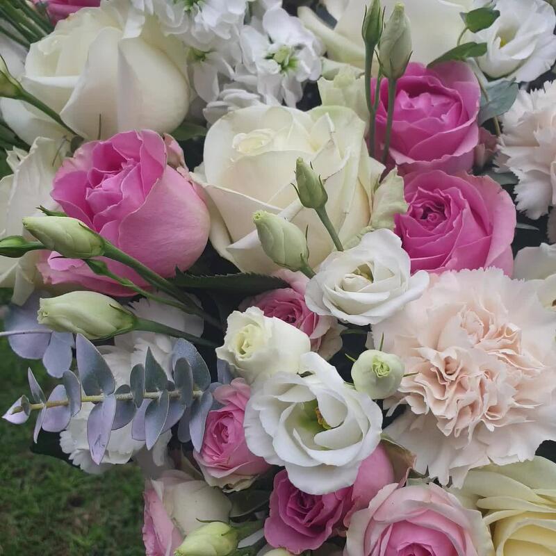 Лента атласная – 3 шт.Корзина плетеная большая – 1 шт.Маттиола белая – 3 шт.Роза белая 50 см – 16 шт.Оазис флористический – 3 шт.Роза розовая 50 см – 19 шт.эустома белая – 7 шт.Эвкалипт Baby Blue – 5 шт.Роза кустовая белая 50 см – 3 шт.гвоздика белая сортовая – 5 шт.роза кустовая розовая пионовидная – 4 шт.гвоздика розовая диантус – 6 шт.октрытка ручной работы – 1 шт.