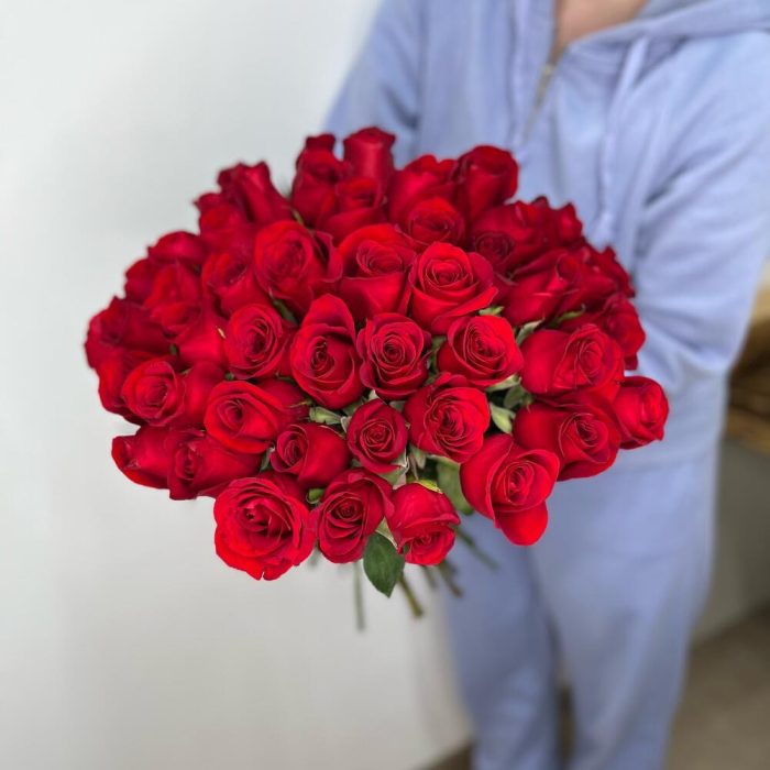 Атласная лента – 1 шт.Роза красная 40 см – 39 шт.