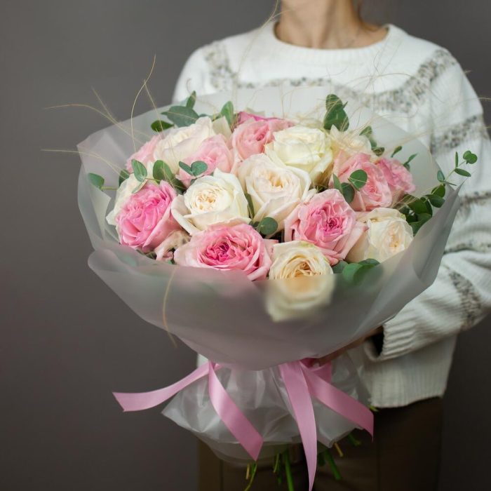 Нежный огромный букет с французскими розами, пион розами и орхидеей