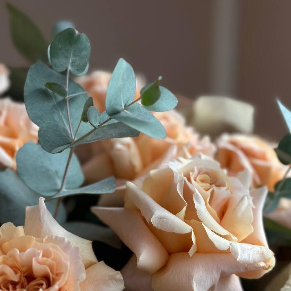 Роза одноголовая – 15 шт.Эвкалипт – 2 шт.Коробка шляпная – 1 шт.Пена флористическая – 1 шт.
