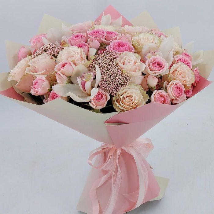 Роскошный и невероятно нежный букет из роз и орхидей. Такой букет всегда уместен и подойдёт для любого повода: День Рождения, именины, годовщина свадьбы, рождение ребенка, 8 марта, День Святого Валентина, выпускной и т.д. Можно вручить маме, сестре, подруге, коллеге, учителю, любимой.