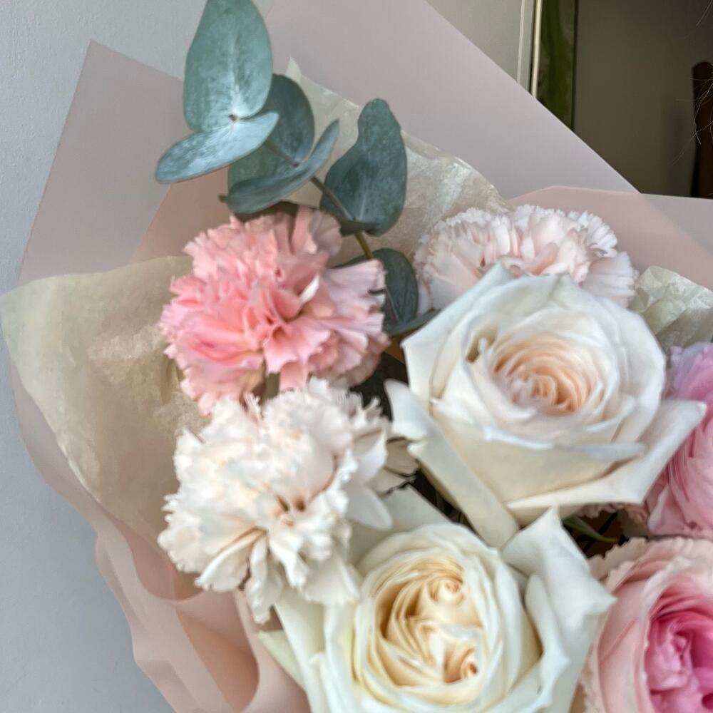 Ранункулюс – 1 шт.white o’hara роза – 3 шт.Диантус – 4 шт.Роза майра – 2 шт.гениста розовая – 2 шт.Эвкалипт Микс – 3 шт.Упаковка дизайнерская – 3 шт.Лента атласная – 1 шт.