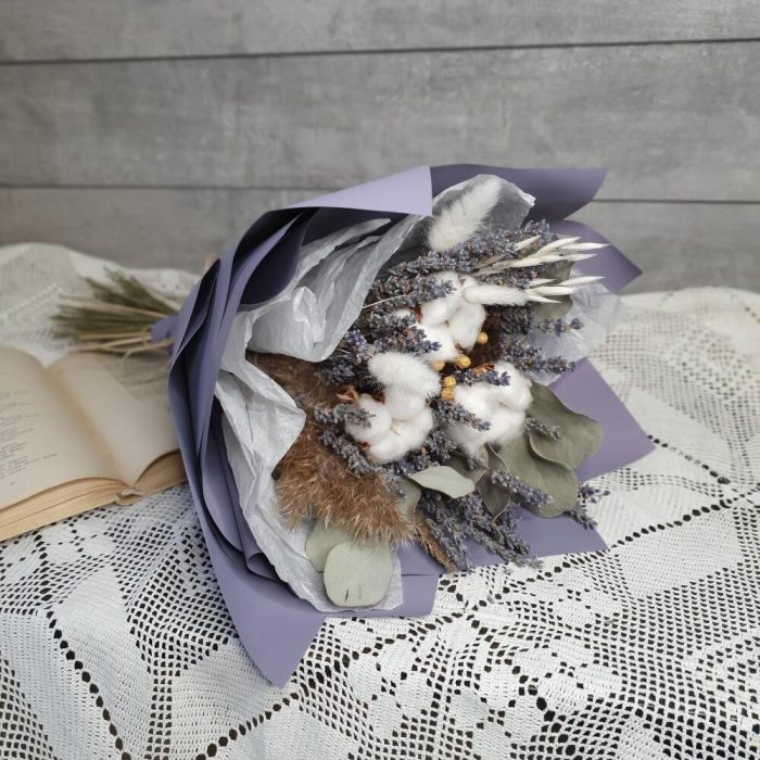 лавандин пучок – 1 шт.Хлопок – 3 шт.Лагурус – 3 шт.овес выбеленный – 2 шт.декоративный камыш банч – 1 шт.